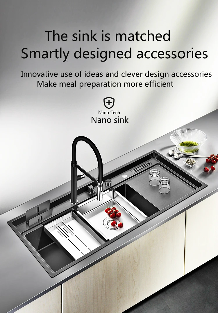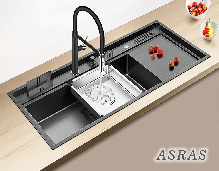 Product Name: Asras11850NK Black Nano Large Kitchen Sink With Faucet & Knife Holder & Draining Board Thicken 304 Stainless Steel Long Sink Set