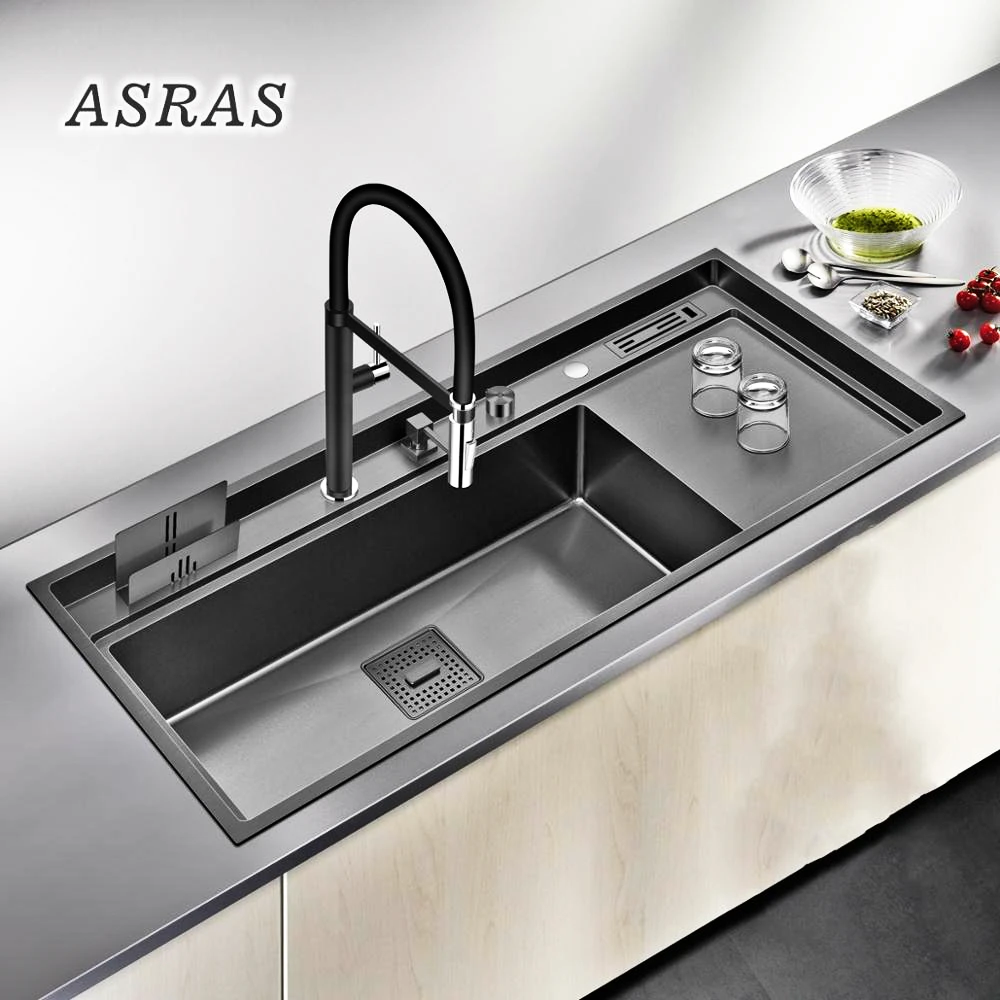 Best . (25% Off) Buy Asras11850NK Black Nano Large Kitchen Sink With Faucet & Knife Holder & Draining Board Thicken 304 Stainless Steel Long Sink Set Cheap Online.